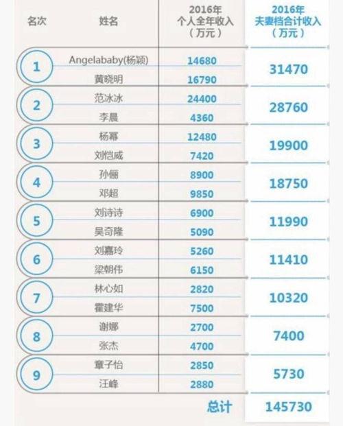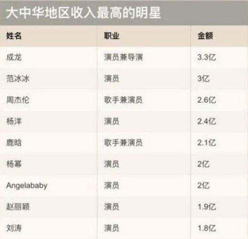 娱乐圈年收入排行,顾名思义,就是根据明星们的年收入进行排名。这个排名通常由各大娱乐媒体和调查机构发布,具有一定的参考价值。这个排名背后却隐藏着许多不为人知的真相。